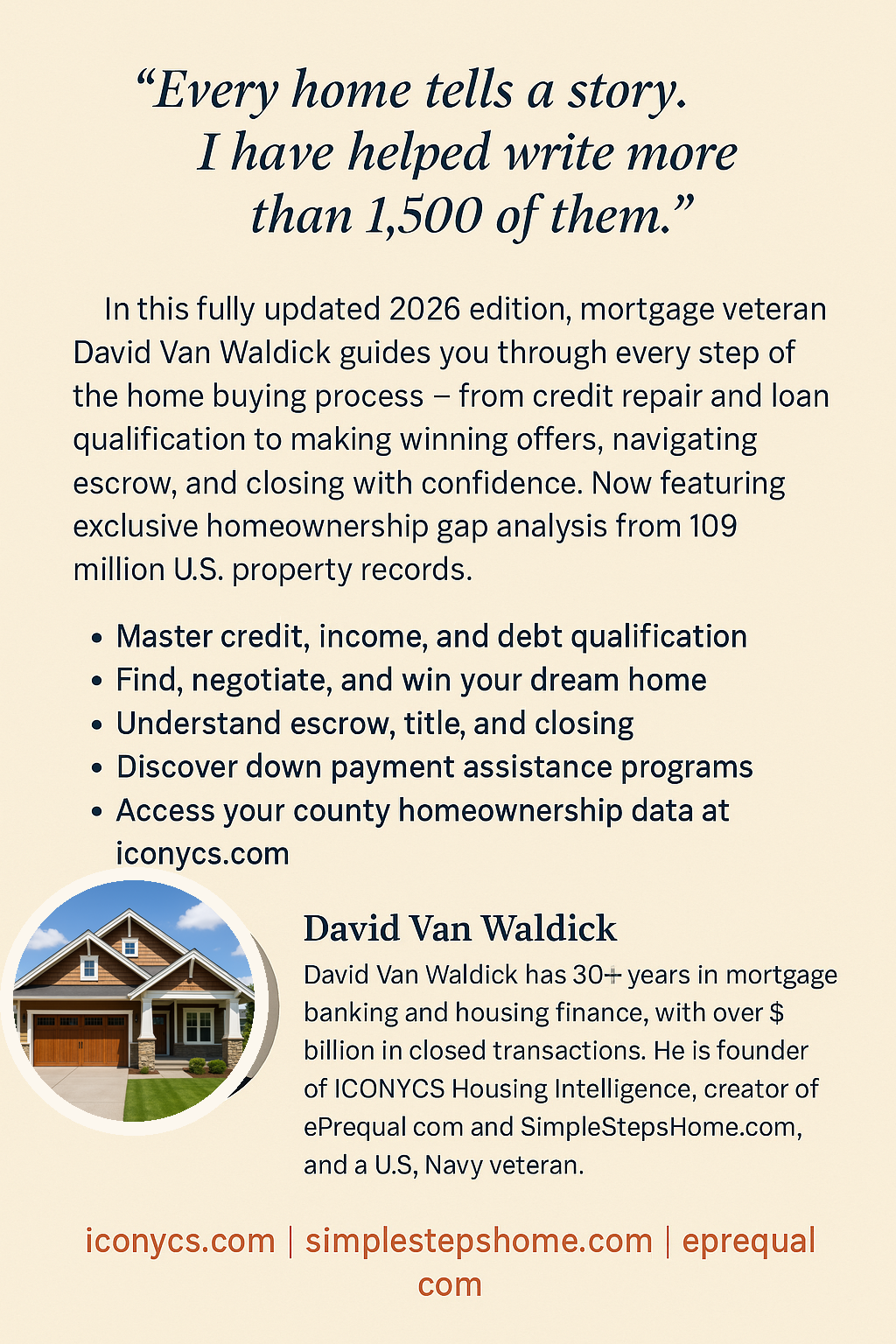 David Van Waldick is a capital markets executive with $2B+ in real estate finance and ABS originations and 25+ years in mortgage banking, real estate, and capital markets. He is the founder of ICONYCS Housing Intelligence, the largest independent U.S. property data platform with 152M+ records, and the author of Home Buying: Master the Process. David also created ePrequal.com and the BuildCoin blockchain real estate token on Solana.